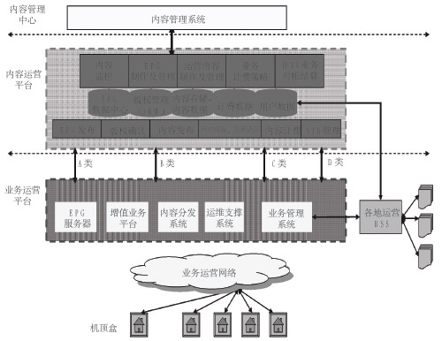 IPTV業(yè)務對系統(tǒng)運行、管理、網(wǎng)絡的要求都非常高,因而必須采用分布式結(jié)構(gòu)來進行部署。從部署層次來分,可分為內(nèi)容管理中心、內(nèi)容集成運營平臺、業(yè)務支撐平臺。