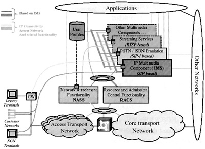 R6中的相關(guān)規(guī)范,但要求支持更多的接入方式,包括xDSL、WLAN、LAN、MAN等。此外,還定義了網(wǎng)絡附著子系統(tǒng)和資源準入控制子系統(tǒng)(RACS)。在這樣的框架下,NGN可以實現(xiàn)基于SIP的業(yè)務、基于SIP-I協(xié)議傳統(tǒng)業(yè)務以及基于RTSP的業(yè)務等。ETSI