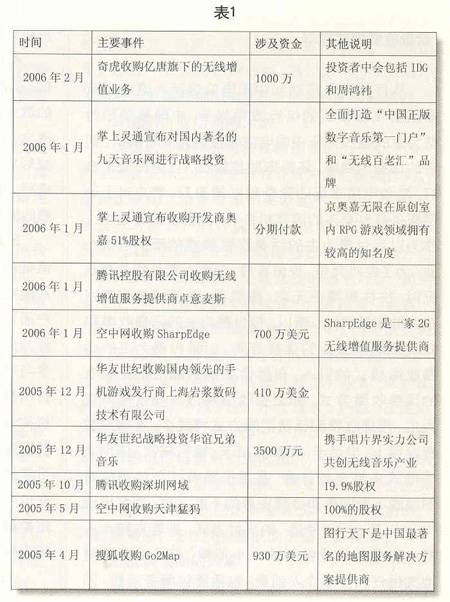 從2003年開始,國內(nèi)就顯現(xiàn)出并購增值服務(wù)運(yùn)營企業(yè)的苗頭。2004年以來,隨著整治增值服務(wù)運(yùn)營企業(yè)的力度不斷加大,并購漸成風(fēng)潮(見表1)。2004年2月,新浪收購深圳網(wǎng)興科技公司;2004年5月,搜狐收購手機(jī)WAP服務(wù)提供商北京吉菲爾公司。2005年,在“超級(jí)女生”節(jié)目大獲成功后,掌上靈通宣布將對(duì)國內(nèi)著名的九天音樂網(wǎng)進(jìn)行戰(zhàn)略投資,全面打造“中國正版數(shù)字音樂第一門戶”和“無線百老匯”品牌。各大移動(dòng)增值業(yè)務(wù)服務(wù)商通過并購競(jìng)爭對(duì)手,門戶網(wǎng)站可以在移動(dòng)增值服務(wù)領(lǐng)域?qū)で笮碌耐黄,獲得可觀的利益,增強(qiáng)自身的競(jìng)爭力。伴隨著3G商用的日益臨近和市場(chǎng)競(jìng)爭的不斷加劇,主流SP(服務(wù)提供商)進(jìn)一步加快了資本購并和業(yè)務(wù)整合的步伐,整個(gè)SP行業(yè)將加速洗牌。經(jīng)過市場(chǎng)整合,主流SP將不斷做大做強(qiáng),而相當(dāng)多的缺乏市場(chǎng)競(jìng)爭力的SP將被淘汰出局。