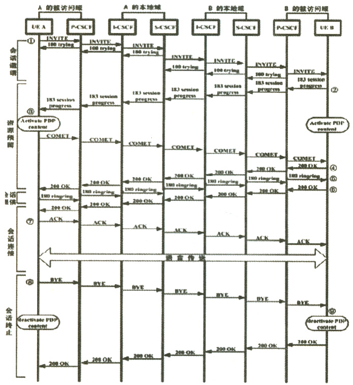 A向P-CSCF發(fā)送一個(gè)INVITE請(qǐng)求消息。該消息中有B和A的SIPURI。P-CSCF注意到A不屬于本地用戶并向A的歸屬地轉(zhuǎn)發(fā)該INVITE消息并返回100trying臨時(shí)應(yīng)答A(表示已經(jīng)發(fā)送A的請(qǐng)求,正在嘗試建立鏈路,A需要等待)。A的本地域I-CSCF向HSS查詢,并向A注冊(cè)時(shí)分配的S-CSCF轉(zhuǎn)發(fā)INVITE并返回100trying給外地P-CSCF。S-CSCF收到請(qǐng)求后將INVITE轉(zhuǎn)發(fā)給被叫B的本地域并返回100trying給I-CSCF。同樣,B歸屬地的I-CSCF接到請(qǐng)求后向HSS查詢并將請(qǐng)求轉(zhuǎn)發(fā)到B的歸屬地S-CSCF,該S-CSCF發(fā)現(xiàn)B正處在外地網(wǎng)絡(luò)中,于是將INVITE轉(zhuǎn)發(fā)到B目前所在地的P-CSCF,接著P-CSCF將請(qǐng)求最后傳給B。