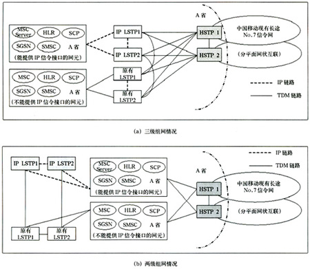 結(jié)合與現(xiàn)有TDM No.7信令網(wǎng)的組網(wǎng)關(guān)系,考慮引入IP信令網(wǎng)的方案有以下幾種。