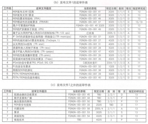 2005年5月之前,下一代網(wǎng)絡重點工作組已完成了計劃中的26個送審文件中的3個。所有的送審文件都必須指定專門的發(fā)布文件。遵循第13研究組的決定,下一代網(wǎng)絡重點工作組至少應完成發(fā)布文件1的送審稿。表2給出了下一代網(wǎng)絡重點工作組按發(fā)布文件分類的送審件。