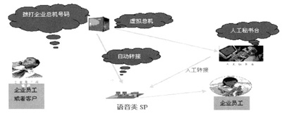 步驟五:如果用戶(hù)不知道員工分機(jī)號(hào)碼或者希望了解其他信息,主叫用戶(hù)可以選擇接入人工秘書(shū)臺(tái)。此時(shí)人工秘書(shū)臺(tái)會(huì)依據(jù)被叫號(hào)碼檢索出被呼叫集團(tuán)的信息,同時(shí)根據(jù)主叫號(hào)碼檢索出主叫用戶(hù)是否為企業(yè)內(nèi)部員工或者企業(yè)客戶(hù),同時(shí)將這些信息同步更新到人工秘書(shū)臺(tái)上,話(huà)務(wù)員根據(jù)這些信息可以完成作為企業(yè)特色話(huà)務(wù)員的服務(wù)工作;