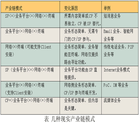 =>網(wǎng)絡(luò)< =>終端,而現(xiàn)實中的產(chǎn)業(yè)鏈模式可以通過該模式變化得到,如下表所示。
