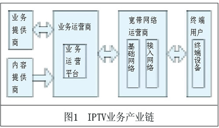 圖1所示的IPTV業(yè)務(wù)產(chǎn)業(yè)鏈中,主要角色包括內(nèi)容提供商/業(yè)務(wù)提供商(CP/SP)、業(yè)務(wù)運營商、網(wǎng)絡(luò)運營商和終端用戶。業(yè)務(wù)運營商具有IPTV業(yè)務(wù)運營資質(zhì),通過業(yè)務(wù)運營平臺保證業(yè)務(wù)的提供和管理運營,起著業(yè)務(wù)主導(dǎo)的作用;內(nèi)容提供商為業(yè)務(wù)運營商提供內(nèi)容,業(yè)務(wù)提供商向業(yè)務(wù)運營商提供增值業(yè)務(wù),使得業(yè)務(wù)中的內(nèi)容和種類豐富多彩以滿足用戶的不同需求,內(nèi)容提供商和業(yè)務(wù)提供商一般能根據(jù)用戶的使用情況獲取收入分成;網(wǎng)絡(luò)運營商通過提供基礎(chǔ)網(wǎng)絡(luò)和接入網(wǎng)絡(luò)服務(wù)保證業(yè)務(wù)的傳送和質(zhì)量;終端用戶通過使用終端設(shè)備選擇和使用業(yè)務(wù),并支付相關(guān)費用。