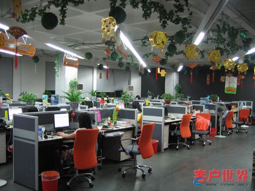 整個(gè)服務(wù)現(xiàn)場(chǎng)的裝修以桔黃色為主色調(diào),代表溫暖、和諧;格局不規(guī)則化,盡顯現(xiàn)代時(shí)尚的風(fēng)格;辦公室到處是綠色植物,墻上貼滿了各種相片、海報(bào)和宣傳語,天花板掛滿了激勵(lì)口號(hào)板;別具特色的洗手間文化;乒乓球室、休息室、休閑吧,咖啡機(jī)、茶葉、果汁、雪糕、飲料,魚缸、大液晶電視、音響……一點(diǎn)感覺不到這是一個(gè)枯燥的呼叫中心的工作環(huán)境。