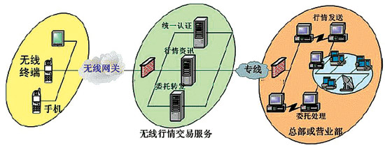 從技術(shù)上說,“移動(dòng)交易廳”主要采用WAP及專用手機(jī)客戶端方式,客戶可以通過訪問證券公司專門申請(qǐng)的域名(如廣發(fā)證券公司的http://wap.gf.com.cn),鏈接到證券公司的WAP手機(jī)炒股系統(tǒng)服務(wù)器,下載手機(jī)客戶端軟件,然后通過無線接入網(wǎng)關(guān)登錄到移動(dòng)證券業(yè)務(wù)平臺(tái)。移動(dòng)證券業(yè)務(wù)平臺(tái)的行情及委托交易系統(tǒng)完全利用現(xiàn)有的網(wǎng)上交易系統(tǒng)的資源。