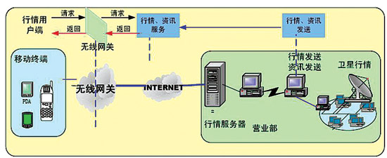 3.移動(dòng)證券應(yīng)用行情/委托平臺(tái)。移動(dòng)證券應(yīng)用行情/委托平臺(tái)可以完全利用券商原有的行情主站與委托主站的現(xiàn)有資源,在移動(dòng)終端客戶端通過中國移動(dòng)的GPRS網(wǎng)絡(luò)發(fā)起登錄請(qǐng)求后,采用與網(wǎng)上交易相同的通信協(xié)議與加密協(xié)議,直接聯(lián)入券商現(xiàn)有的行情主站與委托主站,獲取行情,并實(shí)現(xiàn)交易。券商現(xiàn)有的行情主站和委托主站無需做任何升級(jí)與改動(dòng)。