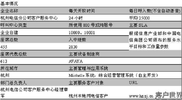 浙江省電信有限公司杭州市分公司客戶服務(wù)中心(以下簡(jiǎn)稱杭州電信客服中心,或者杭州電信10000號(hào))成立于2002年9月,是一個(gè)基于CTI技術(shù)、充分利用通信網(wǎng)和計(jì)算機(jī)網(wǎng)絡(luò)的綜合信息服務(wù)系統(tǒng),以電話為主,輔之以傳真、短信、Email、互聯(lián)網(wǎng)等多種接觸媒體,通過人工、自助語音與網(wǎng)上服務(wù)的方式,為杭州400萬電信客戶提供綜合電信業(yè)務(wù)的咨詢、查詢、受理、投訴、報(bào)障和電話營(yíng)銷。建有2130路中繼通道,1410路自動(dòng)語音通道,186個(gè)人工服務(wù)座席、189個(gè)電話營(yíng)銷座席、80個(gè)外包座席,占地5600多平米,分別位于杭州市惠興路9號(hào)和慶春路133號(hào)。