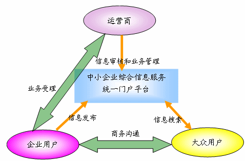 “中小企業(yè)綜合信息服務統(tǒng)一門戶平臺”的角色包括:運營商、企業(yè)用戶、大眾用戶三大角色。各角色與平臺之間及角色之間的業(yè)務關系如下: