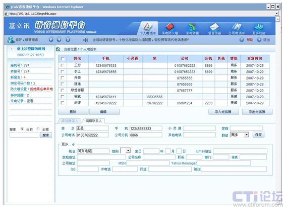 電話本查詢功能允許員工從任何一臺(tái)電話機(jī)(企業(yè)內(nèi)部或者外部電話都可以)查詢自己的電話本中聯(lián)系人信息。該功能對(duì)于出差在外管理人員,緊急時(shí)如果要查詢某客戶資料信息特別有用。例如,可以查詢客戶姓名、電話號(hào)碼、地址等等。
