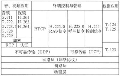 H.323協(xié)議是一個龐大的協(xié)議族,其中又包括許多相關(guān)的子協(xié)議,形成了一個協(xié)議棧,如圖2所示。
