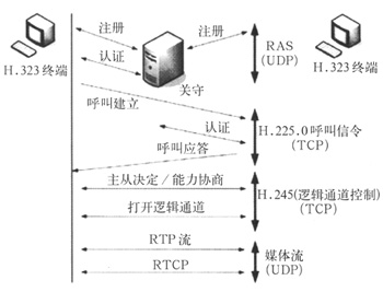 H.323終端之間建立通信關(guān)系通常執(zhí)行四個控制過程:RAS,H.225.0呼叫控制(Q.931信令),連接控制(H.245)及媒體RTP信道建立的過程。