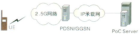 PS方案指直接在GPRS或CDMA 1X核心網(wǎng)絡(luò)上增加PoC服務(wù)器來實現(xiàn)PoC業(yè)務(wù);這種方案是國際標準發(fā)布之前的普遍方案。該方案結(jié)構(gòu)簡單,成本低,PoC服務(wù)器直接與GGSN/PDSN相連,負責PoC業(yè)務(wù)的提供,其網(wǎng)絡(luò)結(jié)構(gòu)如圖3所示: