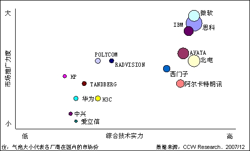 市場(chǎng)競(jìng)爭(zhēng)非常激烈,但還沒有一個(gè)廠商占據(jù)對(duì)優(yōu)勢(shì)。目前統(tǒng)一通信市場(chǎng)形成了兩類供應(yīng)商的競(jìng)爭(zhēng):電信網(wǎng)絡(luò)設(shè)備廠商(如思科、北電)和軟件廠商(如微軟、IBM)。電信設(shè)備廠商的優(yōu)勢(shì)集中在硬件產(chǎn)品上,比如路由器、VoIP網(wǎng)關(guān)產(chǎn)品、軟交換設(shè)備;而軟件廠商,像微軟、IBM的優(yōu)勢(shì)在于其在電腦桌面上的絕對(duì)統(tǒng)治力,幾乎所有的統(tǒng)一通信企業(yè)都需要和微軟、IBM進(jìn)行合作。但從現(xiàn)在的發(fā)展?fàn)顩r來看,各類廠商之間既有競(jìng)爭(zhēng)又有合作,但還沒有一個(gè)廠商占據(jù)對(duì)優(yōu)勢(shì)。