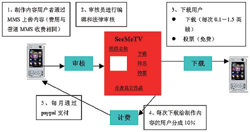 M1新加坡移動運(yùn)營商M1推出了用戶制作及共享視頻業(yè)務(wù)——MeTV,用戶可以通過MMS上傳視頻內(nèi)容,其它用戶可以瀏覽并下載。這項(xiàng)業(yè)務(wù)為用戶提供了一個(gè)展示自己和了解他人的平臺。這個(gè)業(yè)務(wù)也建立了與用戶分成的模式,用戶可以從自己上傳的內(nèi)容中獲得利潤。用戶上傳的視頻內(nèi)容,被他人下載一次,用戶就可以獲得0.05新元。自從2007年3月該業(yè)務(wù)推出以來,已經(jīng)有超過4萬名用戶,收入最高的用戶已經(jīng)達(dá)到50~100新元。