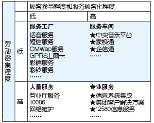 表1中以“★”標(biāo)識(shí)的服務(wù)基本上都是電信運(yùn)營(yíng)企業(yè)開(kāi)展移動(dòng)信息化后向客戶提供的服務(wù),可以明顯看出,更高的顧客參與度、更多的顧客化是這些服務(wù)的共同特點(diǎn),所以,移動(dòng)信息化運(yùn)營(yíng)的就是由服務(wù)工廠向服務(wù)車間轉(zhuǎn)型、由大量服務(wù)向?qū)I(yè)服務(wù)轉(zhuǎn)型。