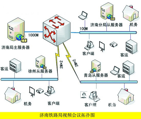根據(jù)濟南鐵路局的視頻會議規(guī)劃和網(wǎng)絡現(xiàn)狀,視維(即山大聯(lián)潤信息科技有限公司)與路局共同設計了會議系統(tǒng)解決方案,在濟南、青島、徐州部署4臺高性能視頻服務器系統(tǒng),利用路局內(nèi)網(wǎng)和公網(wǎng)搭建了覆蓋全路的視頻會議服務平臺。路局的兩臺服務器可以互備,提供了服務器系統(tǒng)和網(wǎng)絡系統(tǒng)的雙備份,大大提高了系統(tǒng)的可靠性。
