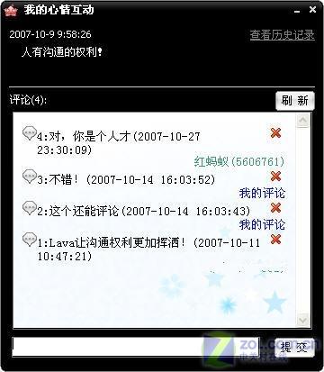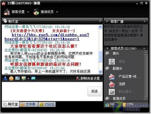 在群聊的過程中兩款軟件都各特色。百度Hi的特色是當用戶向群中一個不是自己好友的人發(fā)送信息時,該用戶會在百度網(wǎng)頁短信息中可以收到消息,此項功能十分適合上班時不能打開聊天軟件的朋友使用。Lava則是將群功能體現(xiàn)的更加強大些,除了消息發(fā)送外可以建立屬于群部落的文件庫,就是這個部落的藏寶室,有什么好東東都可以放進去,簡直就是超大的網(wǎng)絡硬盤。(圖9、圖10)