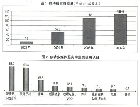 日本的在線購物和拍賣市場(chǎng)起步較晚,但發(fā)展速度較快,用戶的認(rèn)知度也比較高,有41%~48%的移動(dòng)互聯(lián)網(wǎng)用戶使用過該項(xiàng)業(yè)務(wù)。十幾歲到二十幾歲的女性較傾向于使用該業(yè)務(wù)。2006年移動(dòng)拍賣的成交量為1295億日元,占到了通過手機(jī)在線購買成交量的1/2(見圖1)。