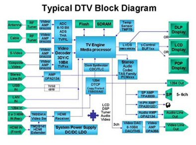 一般來說,數(shù)字電視可以被分解為不到10個主要的模塊:顯示器(和驅(qū)動器)、核心媒體引擎、音頻編解碼和處理、視頻編解碼和處理、調(diào)諧器、接口模塊和電源。對每一個模塊的絕對性能要求由你最喜歡的座位的舒適體驗的性能水平來定義。