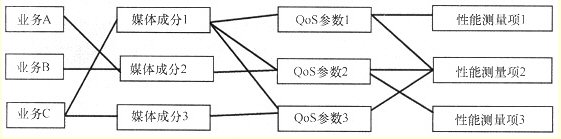 對(duì)于基于IMS的下一代網(wǎng)絡(luò)來說,QoS參數(shù)和業(yè)務(wù)的相關(guān)關(guān)系比較復(fù)雜。對(duì)于一個(gè)IMS業(yè)務(wù),需要保障其包含的所有的媒體成分的服務(wù)質(zhì)量。將IMS業(yè)務(wù)的QoS要求分解為可測(cè)量的網(wǎng)絡(luò)參數(shù)的過程如圖2所示。