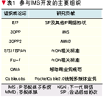 3GPP采用和其他標準化組織密切合作的方式制訂IMS技術(shù)標準,并依靠各國通信界的協(xié)同不斷發(fā)展和完善(如表1所示)。其中,最重要的合作就是和IETF聯(lián)合開發(fā)了IMS網(wǎng)絡(luò)的核心控制協(xié)議SIP[1],共同研究SIP的擴展和應(yīng)用。另一個重要的合作是和Parlay組織聯(lián)合開發(fā)了支持開放式業(yè)務(wù)提供的Parlay/開放業(yè)務(wù)接入(OSA)應(yīng)用程序接口(API),將源于固定智能網(wǎng)結(jié)構(gòu)開放的Parlay技術(shù)引入IMS網(wǎng)絡(luò)的OSA結(jié)構(gòu)[2]。最重要的協(xié)同就是ETSI的TISPAN研究組和ITU-T提出了IMS中融入固定接入的技術(shù)[3],另一個重要的協(xié)同是OMA組織提出了許多基于IMS實現(xiàn)的業(yè)務(wù)規(guī)范和技術(shù)[4]。