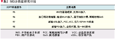 3GPP依照UMTS 3G移動通信系統(tǒng)的系列標準版本定義了IMS的分階段演進計劃[5],如表2所示。其中,2002年完成的R5是第一個全IP移動網(wǎng)絡(luò)標準,它將核心網(wǎng)歸為一個統(tǒng)一的基于IP的分組(PS)域,具有服務(wù)質(zhì)量(QoS)保證,能夠提供各種類型的多媒體增值業(yè)務(wù),其核心技術(shù)標準就是IMS。R6進一步完善IMS接口和功能,增加對于WLAN的接入支持,并研究IMS域的計費和QoS控制技術(shù)。R7融合TISPAN關(guān)于NGN的研究標準,增加對于xDSL接入技術(shù)的支持,提出策略控制與計費(PCC)技術(shù)以及WLAN/3G語音連續(xù)通信的話音連接連續(xù)(VCC)技術(shù)。正在研究中的R8將協(xié)同各個標準化組織的工作,研究支持組合業(yè)務(wù)的業(yè)務(wù)代理技術(shù)以及下一步的統(tǒng)一IMS架構(gòu)。