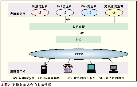 經(jīng)過多年的探索,業(yè)界取得共識網(wǎng)絡(luò)演進必須基于業(yè)務(wù)驅(qū)動的策略。必須指出的是,雖然基于SIP技術(shù)的IMS支持的業(yè)務(wù)從語音業(yè)務(wù)擴展到了寬帶多媒體業(yè)務(wù),然而其控制機理本質(zhì)上還是源于傳統(tǒng)電信網(wǎng),因此它最適合于提供的還是諸如VoIP、集群話音、集群視頻等實時會話型業(yè)務(wù),諸如Web、電子商務(wù)等純數(shù)據(jù)型業(yè)務(wù)并不適合由IMS提供,其他許多有前景的業(yè)務(wù),如流媒體業(yè)務(wù)、IPTV、消息類業(yè)務(wù)等的確IMS已提出或正在積極研究其提供方法,但是已有其他的非IMS提供方式。因此,切不要認為IMS是包羅萬象的,更確切地說,IMS是電信界提出的網(wǎng)絡(luò)融合技術(shù),考慮得更多的必然就是和傳統(tǒng)電信業(yè)務(wù)模式類似的業(yè)務(wù)。為了使IMS在未來融合的信息通信網(wǎng)絡(luò)中繼續(xù)保持其重要的地位,在積極研究擴大IMS業(yè)務(wù)能力的同時,必須研究新的體系結(jié)構(gòu)既能夠包容IMS型業(yè)務(wù),也能夠包容非IMS型業(yè)務(wù),由此形成融合的開放式的業(yè)務(wù)平面。這就是熱點研究之中的業(yè)務(wù)代理技術(shù),實際上就是架構(gòu)在IMS之上的綜合業(yè)務(wù)平臺,如圖2所示。它至少能夠提供4大類業(yè)務(wù):IMS類業(yè)務(wù)、消息類業(yè)務(wù)、流媒體業(yè)務(wù)、Web業(yè)務(wù)以及它們的組合,也就是說,除了IMS系統(tǒng)的SIP協(xié)議和API以外,業(yè)務(wù)平臺還應(yīng)能支持其他眾多的非IMS系統(tǒng)協(xié)議和接口,由此構(gòu)成融合的業(yè)務(wù)層。IMS系統(tǒng)是其中的一個重要組成部分,擔(dān)負起通信網(wǎng)絡(luò)的融合重任。