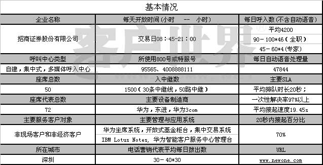 伴隨著招商證券業(yè)務(wù)種類的豐富、經(jīng)紀(jì)業(yè)務(wù)的迅猛發(fā)展,目前中心配備50名高素質(zhì)座席代表、日均受理電話量4200通、接通率保持在96%以上的規(guī)模與水平,并以全面的專業(yè)技能、優(yōu)質(zhì)標(biāo)準(zhǔn)化的服務(wù)在證券行業(yè)中已處于領(lǐng)先水平,引導(dǎo)了證券業(yè)內(nèi)經(jīng)紀(jì)業(yè)務(wù)電話服務(wù)的標(biāo)準(zhǔn),在業(yè)內(nèi)及客戶群中樹立了良好的口碑,成為客戶和行業(yè)公認(rèn)的楷模與標(biāo)桿,促進(jìn)了證券行業(yè)服務(wù)品質(zhì)的提升,引領(lǐng)了證券行業(yè)非現(xiàn)場服務(wù)的新潮流;改善了公司營業(yè)部現(xiàn)場服務(wù),無法完全滿足客戶日益增長的需求狀況,給客戶帶來了不錯的客戶體驗,為公司服務(wù)升級和業(yè)務(wù)發(fā)展提供了有力保障和支撐。