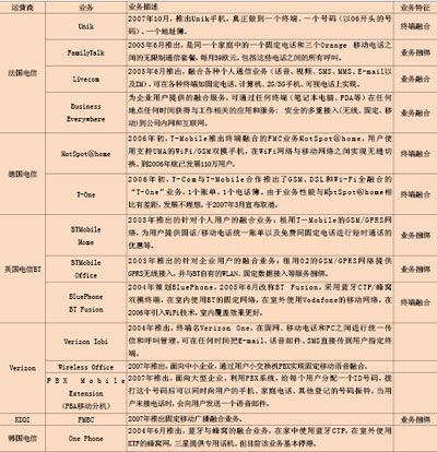 從全球范圍來(lái)看,大多數(shù)重要的固定運(yùn)營(yíng)商、移動(dòng)運(yùn)營(yíng)商和綜合性運(yùn)營(yíng)商都已經(jīng)開始或計(jì)劃提供各種形式FMC業(yè)務(wù)(見表)。其中大多數(shù)運(yùn)營(yíng)商提供捆綁業(yè)務(wù)和簡(jiǎn)單的融合業(yè)務(wù),而歐美的一些頂尖運(yùn)營(yíng)商已推出基于融合終端的FMC業(yè)務(wù)。