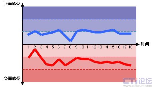 圖2的情感曲線分別是中國移動的“喜愛”情感曲線和中國電信的“討厭”情感曲線,對應于雙方整個呼入電話體驗18個子流程上的情感感受。(注意,我們只列出了中國移動的“喜愛”曲線和中國電信的“討厭”曲線來舉例說明。)