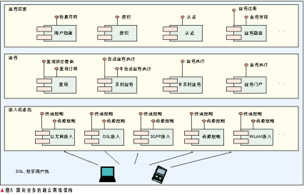 在圖1的網(wǎng)絡(luò)層次中,存在4種服務(wù)商角色:接入網(wǎng)提供商、業(yè)務(wù)網(wǎng)運(yùn)營(yíng)商、業(yè)務(wù)提供商、聚合門戶網(wǎng)站。業(yè)務(wù)網(wǎng)運(yùn)營(yíng)商可以在用戶簽約時(shí)提供多個(gè)業(yè)務(wù)提供者、聚合門戶網(wǎng)站的簽約選項(xiàng),用戶可以選擇在成為業(yè)務(wù)網(wǎng)運(yùn)營(yíng)商的客戶的同時(shí)也成為多個(gè)感興趣的業(yè)務(wù)提供商的會(huì)員,后兩者可以訪問(wèn)業(yè)務(wù)網(wǎng)運(yùn)營(yíng)商的認(rèn)證、授權(quán)和計(jì)費(fèi)(AAA)基礎(chǔ)設(shè)施,從而對(duì)用戶身份進(jìn)行統(tǒng)一的認(rèn)證、授權(quán)和計(jì)費(fèi)。業(yè)務(wù)提供商和業(yè)務(wù)網(wǎng)運(yùn)營(yíng)商之間的劃分可以采用結(jié)算制也可以采用批發(fā)業(yè)務(wù)的方式。