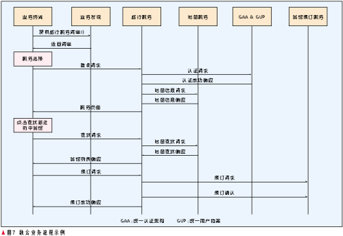 首先王先生的PDA通過(guò)歸屬網(wǎng)絡(luò)的業(yè)務(wù)發(fā)現(xiàn)服務(wù)器獲得旅行服務(wù)的主頁(yè)列表,他選擇一家訪問(wèn)其旅行服務(wù),旅行服務(wù)通過(guò)其歸屬網(wǎng)絡(luò)的GAA&GUP對(duì)該終端進(jìn)行認(rèn)證以及提供旅行服務(wù)的授權(quán),成功后,旅行服務(wù)向地圖服務(wù)請(qǐng)求地圖信息并隨服務(wù)頁(yè)面一齊返回給終端,王先生點(diǎn)擊查找“離我最近的中餐館”按鈕,旅行服務(wù)將請(qǐng)求代理轉(zhuǎn)發(fā)給地圖服務(wù),后者返回中餐館列表(用戶的位置信息可以由用戶上報(bào),或者由旅行服務(wù)查詢用戶歸屬網(wǎng)絡(luò)的位置服務(wù)獲得),旅行服務(wù)轉(zhuǎn)發(fā)給終端,當(dāng)王先生選擇一個(gè)中餐館并預(yù)訂時(shí),旅行服務(wù)調(diào)用該餐館的預(yù)訂服務(wù),訂單傳給相應(yīng)服務(wù)人員,流程完成。