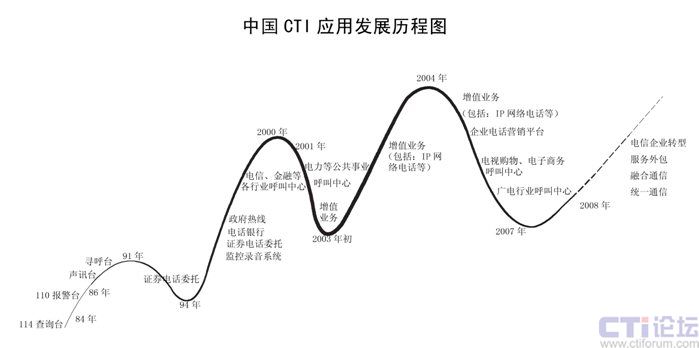 CTI在中國(guó)已經(jīng)發(fā)展了二十多年,已經(jīng)從最早的電信行業(yè)CTI應(yīng)用發(fā)展到金融(包括銀行、保險(xiǎn)、證劵及基金)、電力、郵政、企業(yè)(包括煙草、汽車、家電、IT、互聯(lián)網(wǎng)、旅游、報(bào)業(yè)、航空、物流、醫(yī)療、公共事業(yè)等)、政府、軍隊(duì)等各行各業(yè)的應(yīng)用。特別在1995年到2001時(shí)期,是CTI應(yīng)用發(fā)展最快,普及面最廣的時(shí)期,也是CTI市場(chǎng)進(jìn)入了第二次高潮;從2002開始增值業(yè)務(wù)是整個(gè)CTI行業(yè)的突破口,整個(gè)行業(yè)以增值業(yè)務(wù)為主,CTI市場(chǎng)進(jìn)入了第三次高潮;從2006年開始,增值業(yè)務(wù)進(jìn)入了衰退期,整個(gè)CTI行業(yè)市場(chǎng)出現(xiàn)了嚴(yán)重的危機(jī),加上新的技術(shù)出現(xiàn),技術(shù)的換代,對(duì)原來(lái)的傳統(tǒng)語(yǔ)音產(chǎn)品和公司是個(gè)致命的打擊。