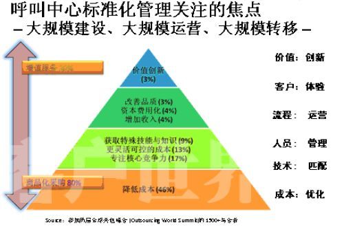 那么,對(duì)于這個(gè)尚處在”嬰兒潮”時(shí)期的產(chǎn)業(yè),我們最應(yīng)該做些什么來(lái)呵護(hù)和培育這個(gè)產(chǎn)業(yè)健康有序的發(fā)展?大家要好好呵護(hù)這個(gè)行業(yè)。如果只是強(qiáng)調(diào)“要想讓呼叫中心發(fā)展,那就需要我們多投錢,這樣就能買許多機(jī)器,放在公司里面。規(guī)格有了,那呼叫中心就發(fā)展了!蔽矣X(jué)得這樣的說(shuō)法是對(duì)呼叫中心發(fā)展的錯(cuò)誤理解。我們這個(gè)標(biāo)準(zhǔn)是希望營(yíng)建專業(yè)化的產(chǎn)業(yè),整個(gè)呼叫中心產(chǎn)業(yè)的價(jià)值金字塔,這個(gè)金字塔每年在美國(guó)有一個(gè)專場(chǎng),就叫呼叫中心專場(chǎng),標(biāo)志一個(gè)產(chǎn)業(yè)成熟的金字塔是怎樣的。通過(guò)調(diào)查發(fā)現(xiàn),當(dāng)產(chǎn)業(yè)進(jìn)入成熟階段,標(biāo)準(zhǔn)化服務(wù)的第一個(gè)就是降低成本,也就是提高生產(chǎn)效益,能夠把這個(gè)產(chǎn)業(yè)細(xì)化分解,高度的模塊化進(jìn)行精細(xì)控制的時(shí)候,其他的差異化的體現(xiàn)。呼叫中心本身是不是成為企業(yè)核心競(jìng)爭(zhēng)力的一部分,或者說(shuō)越來(lái)越成熟的外包商出現(xiàn),能夠把一些企業(yè)非核心競(jìng)爭(zhēng)力加入到自己的核心競(jìng)爭(zhēng)力之上,這叫專業(yè)化。還有一個(gè)更加靈活可控的成本,呼叫中心的彈性從一百人到一千人,一千人到三千人的發(fā)展更加可控。還有獲得特殊技能與知識(shí),事實(shí)上呼叫中心各行各業(yè)知識(shí)都會(huì)接觸,你只有專著才能做得更好,本身對(duì)于呼叫中心的從業(yè)人員來(lái)說(shuō),在這個(gè)產(chǎn)業(yè)中扮演的角色不是締造一個(gè)企業(yè)的核心競(jìng)爭(zhēng)力,怎么期望從業(yè)人員掌握更多的技能和知識(shí),來(lái)指導(dǎo)更多的行業(yè)和企業(yè)。特別是在客戶導(dǎo)向上面的發(fā)展,還有在金字塔上面增加收入,分析客戶所需,讓我們更好的滿足客戶的需求;然后資本費(fèi)用化,從外包專業(yè)化領(lǐng)域帶來(lái)的變化,很多的時(shí)候最大的一筆建設(shè)是呼叫中心,基本一個(gè)中等的呼叫中心沒(méi)有500萬(wàn)以上的資金投入是不可想象的。