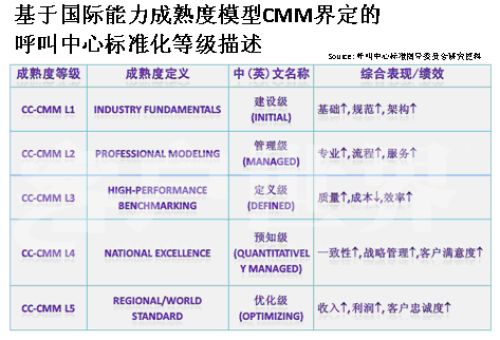 Markets)呼叫中心產(chǎn)業(yè)深入研究相結(jié)合的成果。。我在前幾年企業(yè)實(shí)施標(biāo)準(zhǔn)的時(shí)候深入研究了這套模型,這套模型對(duì)我們呼叫中心產(chǎn)業(yè)有極大的適用性,幾乎每個(gè)呼叫中心都可以在這套模型找到定位,從一個(gè)渾沌的初始過(guò)程到管理者,如果能夠建設(shè)一個(gè)持續(xù)的管控的流程到定義級(jí),如何進(jìn)行一致化管理,再到預(yù)知級(jí),幾乎每個(gè)呼叫中心從大到小,從年輕到發(fā)展一段時(shí)間都可以找到自己的定位,所以我們?cè)谠瓉?lái)的信息產(chǎn)業(yè)指導(dǎo)委員會(huì)的支持下,我們重新結(jié)合CMM模型開(kāi)發(fā)出了符合我們呼叫中心發(fā)展的一個(gè)標(biāo)準(zhǔn),我建議大家把它看成是一個(gè)模型,整個(gè)國(guó)際產(chǎn)業(yè)都定性了標(biāo)準(zhǔn),因?yàn)榇蠹叶贾繡MM模型是一個(gè)開(kāi)放性的知識(shí)體系,并不是一個(gè)封閉標(biāo)準(zhǔn)。CMM模型,首先你的呼叫中心建設(shè)要能夠符合呼叫中心的定義,不是找?guī)着_(tái)話機(jī)或?qū)ν庥袀(gè)一個(gè)客服號(hào)碼對(duì)外就能稱為呼叫中心。