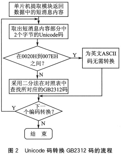 單片機(jī)通過(guò)串口與模塊連接后,發(fā)送讀取第一條新短消息指令:“AT+CMGR=1”。提取模塊接收的短消息后,先判斷其內(nèi)容是否為ASCII碼。若為ASCII碼,則無(wú)需轉(zhuǎn)換直接讀;否則,通過(guò)查表法查找其對(duì)應(yīng)的漢字GB碼,實(shí)現(xiàn)不同編碼間的轉(zhuǎn)換。轉(zhuǎn)換流程如圖2所示。
