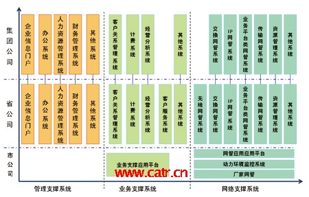 從系統(tǒng)部署來看,目前各大運(yùn)營企業(yè)都以集團(tuán)與省公司為主要的建設(shè)與管理維護(hù)單位,建成了集團(tuán)與省兩級模式的支撐系統(tǒng)。集團(tuán)公司的系統(tǒng)主要提供面向全公司的企業(yè)管理、經(jīng)營分析等功能;省公司從職能管理單位逐步轉(zhuǎn)向了兼顧管理、生產(chǎn)的單位,具有了越來越多的生產(chǎn)職能,在運(yùn)營支撐系統(tǒng)建設(shè)中的作用較為突出,一般情況下,在遵循集團(tuán)公司的總體指導(dǎo)思想下,可自行規(guī)劃與建設(shè)本省的支撐系統(tǒng);市公司的生產(chǎn)職能有所削弱,主要負(fù)責(zé)市場營銷、客戶支撐以及設(shè)備的現(xiàn)場維護(hù)等工作,因而主要是支撐系統(tǒng)的使用單位。