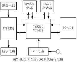 此語音識別系統(tǒng)的目的讓機(jī)器人能聽懂我們所發(fā)出的簡單的命令,首先由TLC320AD50C采集計(jì)算機(jī)聲卡的語音,經(jīng)過轉(zhuǎn)換后送給TMS320VC5402, TMS320VC5402完成語音信號處理,即識別出所發(fā)出的語音,然后把結(jié)果送給AT89S52顯示,同時(shí)通過串行通訊送給機(jī)器人(PC-104),以使機(jī)器人能夠控制自己的行動。其結(jié)構(gòu)框圖如圖2所示。