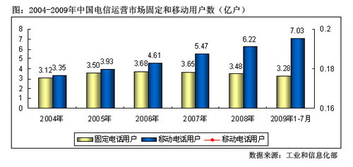 圖: 2004-2009年中國電信運營市場固定和移動用戶數(shù)
