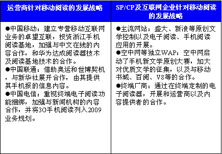 隨著3G的啟動,越來越多的傳統(tǒng)互聯(lián)網(wǎng)巨頭、運營商、手機廠商等紛紛介入無線互聯(lián)網(wǎng)領域,而更多的新興企業(yè)也加入到競爭中來。從目前市場的發(fā)展情況來看,運營商由于其依托的用戶資源以及對網(wǎng)絡資源的控制,在移動閱讀產(chǎn)業(yè)中占據(jù)了優(yōu)先的主動權,然而針對移動閱讀,其內(nèi)容資源環(huán)節(jié)稍顯薄弱,傳統(tǒng)電子書產(chǎn)品資源豐富然而涉及版權問題,不能大規(guī)模應用于移動領域,因此優(yōu)質的內(nèi)容將是移動閱讀產(chǎn)業(yè)發(fā)展的核心競爭優(yōu)勢。針對此,運營商也相應加大了對優(yōu)質內(nèi)容的挖掘和控制。以中國移動為例,于2009年3月和浙江省人民政府代表簽署了長期戰(zhàn)略合作協(xié)議,并將在兩年內(nèi)投入5000萬元,支持浙江手機閱讀基地的建設。