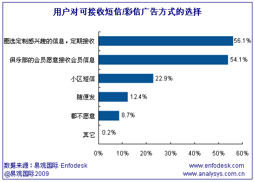 從用戶對(duì)短信廣告的接受程度來看,用戶對(duì)于自己感興趣領(lǐng)域的短信廣告并不反感,甚至樂于接受或定制。根據(jù)易觀國際Enfodesk發(fā)布的用戶調(diào)研數(shù)據(jù),56.1%的用戶愿意定制自己感興趣的信息,54.1%的用戶愿意接受會(huì)員信息,只有8.7%的用戶不愿意接受任何形式的短信/彩信廣告。但是這類用戶樂于接受的短信廣告反而一般有固定的端口號(hào),更容易被攔截,因此易觀國際(Analysys