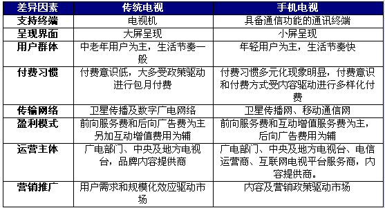 另外通過在終端支撐、網(wǎng)絡(luò)傳輸、盈利模式和覆蓋用戶來看,手機電視產(chǎn)業(yè)和傳統(tǒng)電視也存在著比較大的差異: