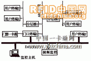 系統采用了兩套獨立的網絡系統,第一套是基于485總線半雙工網絡系統,第二套是基于以太網的局域網;485總線半雙工網絡系統用以連接門口終端、分層器和用戶終端,這主要是從成本上考慮。由于這三部分交換的信息比較少,數據交換的速度要求也不是很高而且實現比較簡單,故采用了這種網絡系統。