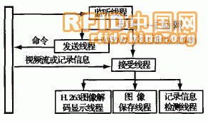 在軟件設計方面包括兩部分,一部分是監(jiān)控終端的監(jiān)控軟件,另一部分是各便件的底層軟件。監(jiān)控終端采用了多線程的軟件設計方法,系統對連接的每一個監(jiān)控點共采用了6個線程,即網絡監(jiān)聽線程、發(fā)送線程、接受線程、H.26 3圖像解碼顯示線程、圖像保存線程和記錄信息(門口終端的撥號、門禁一卡通等記錄信息)檢測線程,如圖4所示。