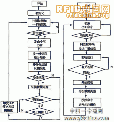 對于底層軟件,主要是門口終端的控制軟件,其工作流程如圖5所示。門口終端上電后,先進行初始化工作,然后開始掃描按鍵和一卡通信息,當確認有變化時,微處理器CPU l先給分層器發(fā)送一幀信息,并且監(jiān)聽分層器的反饋信息,同時啟動DSP通過網絡端口發(fā)送廣播消息給監(jiān)控終端,以便啟動監(jiān)控終端的接受線程接受視頻流和訪問信息或一卡通信息。當時間超過l min或終止鍵按下時,雙方終止通信,門口終端與監(jiān)控終端之間由CPU1觸發(fā)DSP中斷,使其停止發(fā)送視頻流數據。