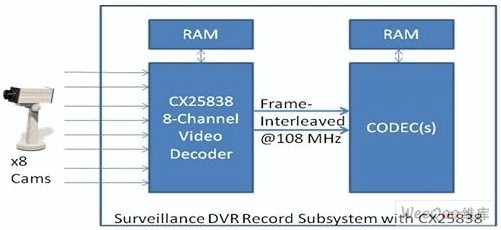為了應對這個挑戰(zhàn)并降低集成成本,科勝迅系統(tǒng)公司新近推出8通道視頻解碼器CX25838和CX25858,可提供幀交錯輸出并與監(jiān)控DVR中普遍使用的編解碼器兼容。圖2顯示了當帶有幀交錯輸出的CX25838