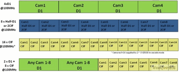 CX25838為監(jiān)控DVR設計人員提供機會,通過提供幀交錯數(shù)據(jù)實現(xiàn)編解碼器效率最大化,而不采用昂貴的FPGA或可編程邏輯。它還通過提供各種分辨率和幀速率,在一系列產(chǎn)品*享系統(tǒng)架構,提供規(guī)模優(yōu)勢的能力。例如,低成本DVR可采用一個編解碼器以全幀速率壓縮16個CIF分辨率通道,這可通過一條8位總線實現(xiàn)。其他解決方案可能需要每個編解碼器以全幀速率壓縮4個D1分辨率通道。還有些可能需要降低幀速率的D1