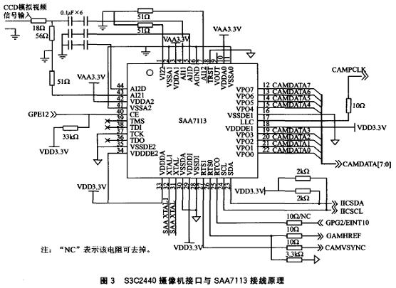 4:2:2格式。對SAA7113初始化需要通過I2C 總線進行,而S3C2440內部集成的I2C控制器正好可以實現(xiàn)這個過程。S3C2440的攝像機接口與SAA7113的連接原理如圖3所示。